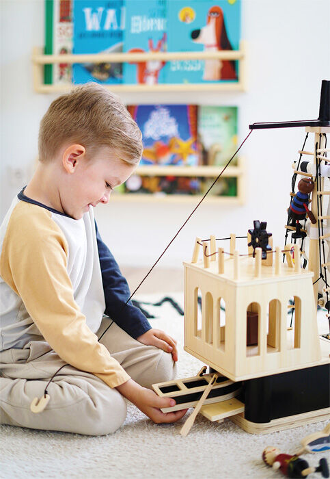 Ahoj piráti! Tato propracovaná pirátská loď vyrobená z robustního dřeva splní přání díky mnoha autentickým detailům. Loď obsahuje také člun, na kterém mohou veslovat dva pohybliví piráti. Obsahuje také žraloka, papouška, truhlu s pokladem, dělo, dva sudy, prkno, vlajku. Všechny plachty lze zvednout a vytáhnout pomocí lan, stejně jako na skutečné lodi. Dělo, které vystřeluje své tři plstěné dělové koule vzduchem, přidává další dávku zábavy. Hrací sada s velkou pirátskou lodí se ideálně hodí pro hru plnou fantazie pro odvážné bukanýry, kteří prozkoumávají moře, objevují nové země a vydávají se na lov pokladů! Interiér pirátské lodi nabízí spoustu úložného prostoru pro všechny nalezené poklady a také truhlu s pokladem na obzvlášť cennou kořist. Pohyblivá kotva připevněná k lanovému navijáku, provazové žebříky, jeřáb, padací dveře na palubě a poklop na zádi, to vše poskytuje příležitost pro realistickou hru. Když má být loď odložena prostorově úsporným způsobem, lze zábradlí a stěžně lodi snadno odstranit. Vhodné pro figurky do velikosti 12 cm.