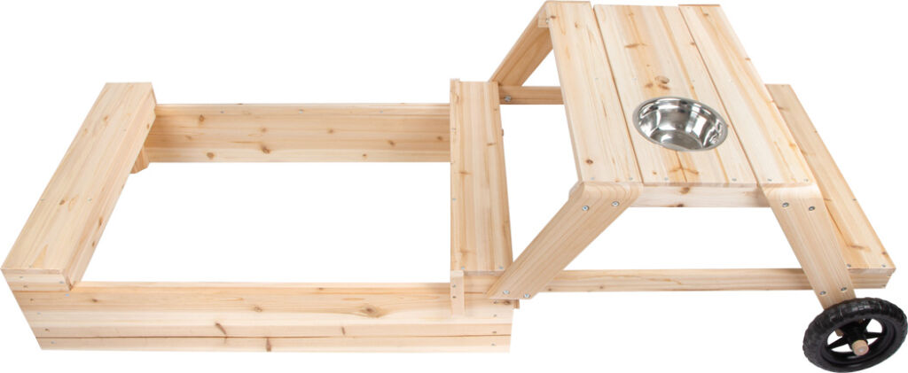 Multifunkční pískoviště 3v1 zajistí dětem spoustu zábavy, ale i místo pro odpočinek. Kompaktní pískoviště z robustního neošetřeného masivního dřeva je díky své unikátní konstrukci pískovištěm, stolem na tvoření a posezením v jednom. Nabízí tak extra porci herní hodnoty na malém prostoru. V případě posunutí horní části pískoviště lze současně využívat pískoviště a sezení se stolem. Díky odnímatelné kovové misce se z povrchu stolu rychle stane stůl k tvoření např. bahna. Otvor v ploše stolu nabízí prostor pro malý slunečník. Když se pískoviště nepoužívá, kvalitní textilní potah Oxford zajistí, že pískoviště zůstane čisté a chráněné před znečištěním.