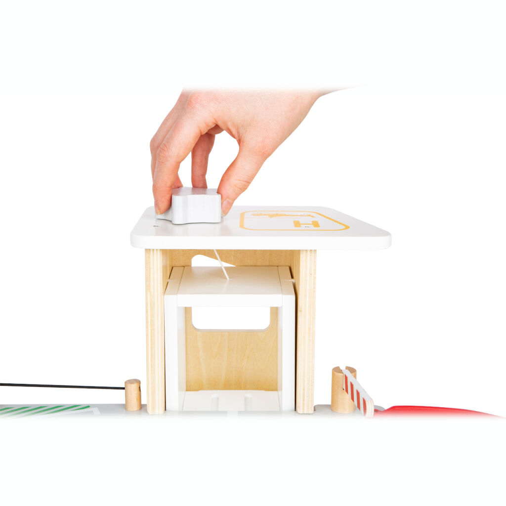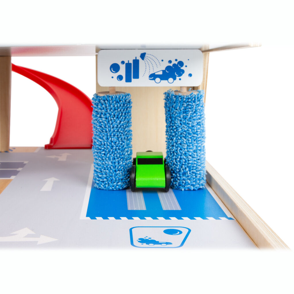 Parkujte, tankujte, myjte nebo opravujte, a to vše s jednou garáží! Nabízí tři bohatě vybavená podlaží propojená atraktivním funkčním výtahem a zábavnými, na sebe plynule navazujícími rampami. Její součástí je dvojice autíček, která mohou při fantastických hrách využít pumpy, nabíjecí stanice, zvedací rampy, nebo myčky s realistickými kartáči. Každá z úrovní je navíc opatřena mechanickou závorou pro dokonale poutavé zážitky. Patra jsou opatřena gumovým hrazením, které dodávají jízdě autíček na dynamice a brání jejich vypadnutí. Garáž je podrobně zdobena mnoha barevnými ikonami a značením, které do her vnese i poučení. Je vyrobena ze silné, pevné a odolné dřevěné překližky s doplňky z masivního dřeva a nezávadného plastu. Výrobek vyžaduje montáž, dodáváno s obrázkovým návodem k sestavení.