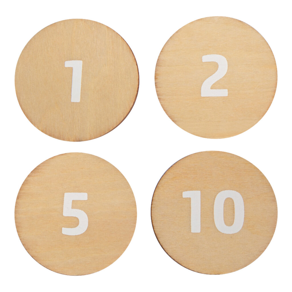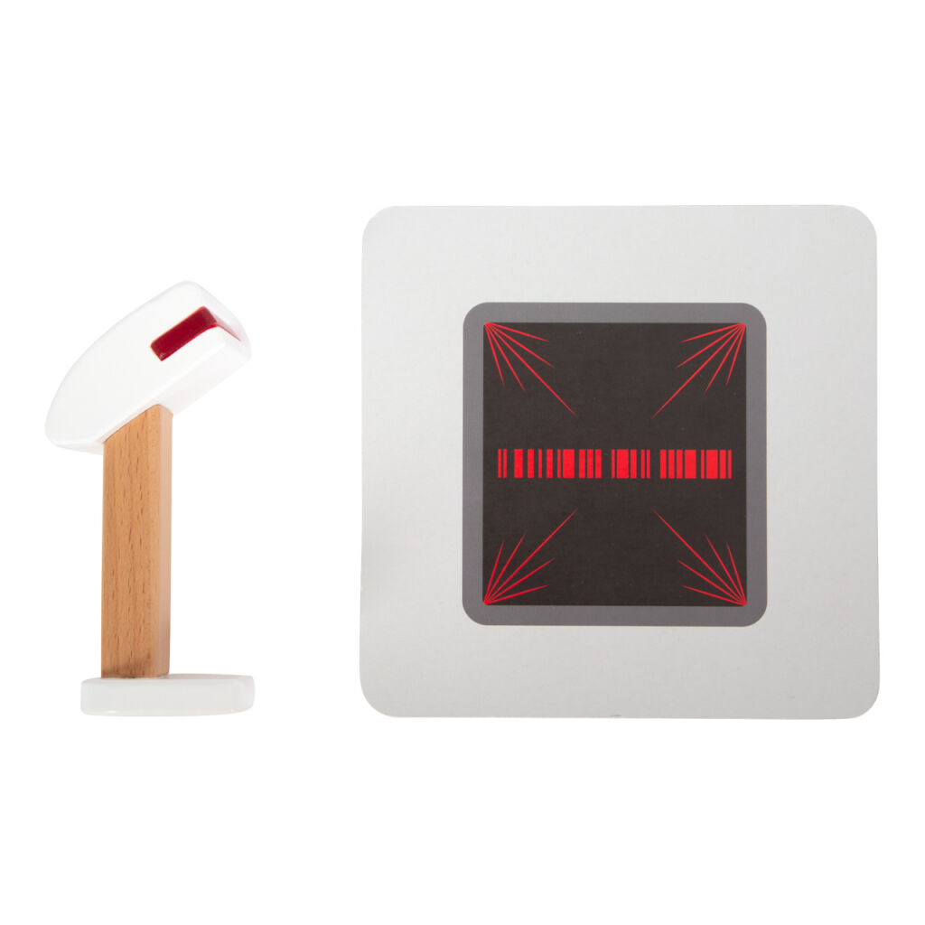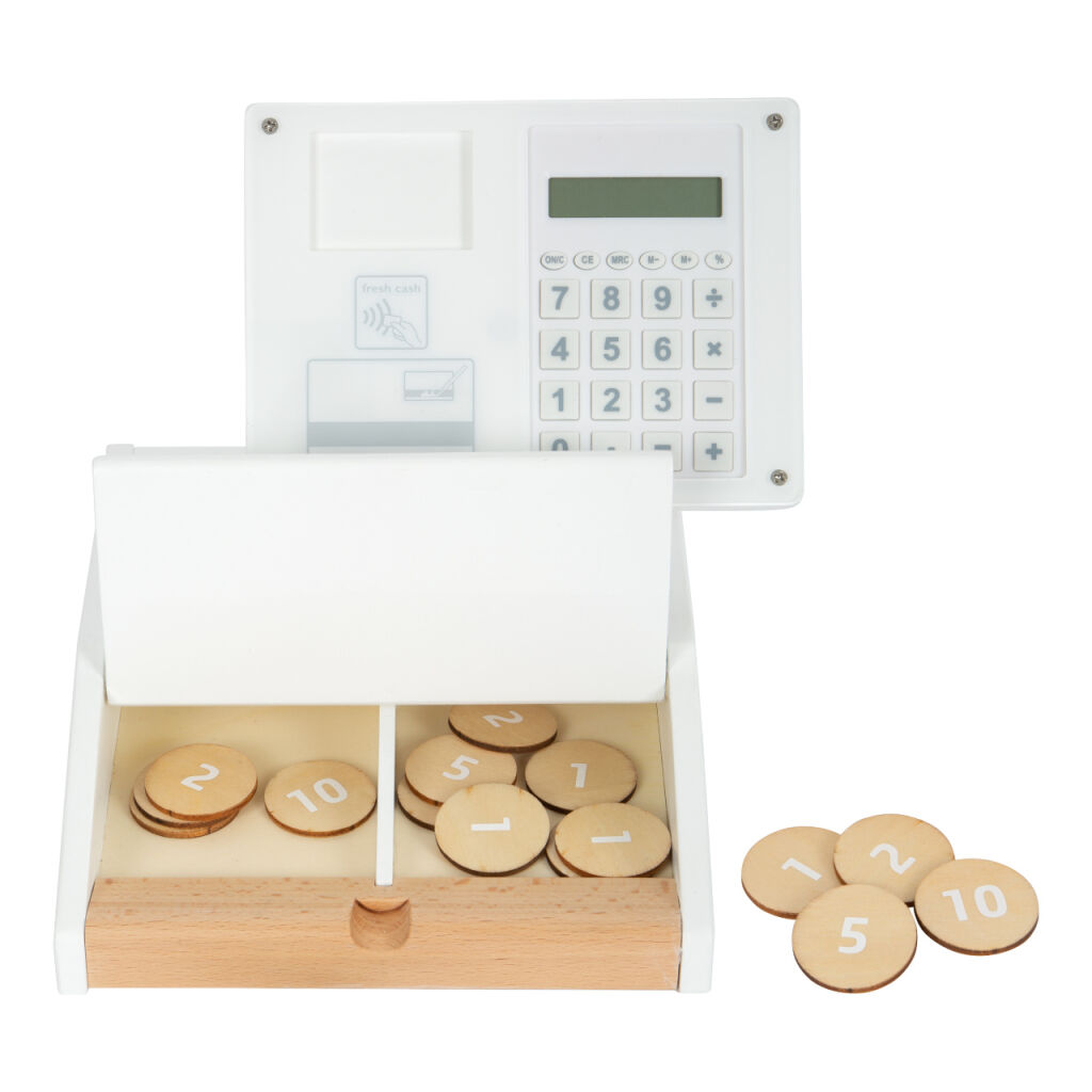 - čtečka čárových kódů, trhací role účtenek, otočný monitor, fungující kalkulačka, platební karta, karty produktů, 15 oboustranných dřevěných mincí
