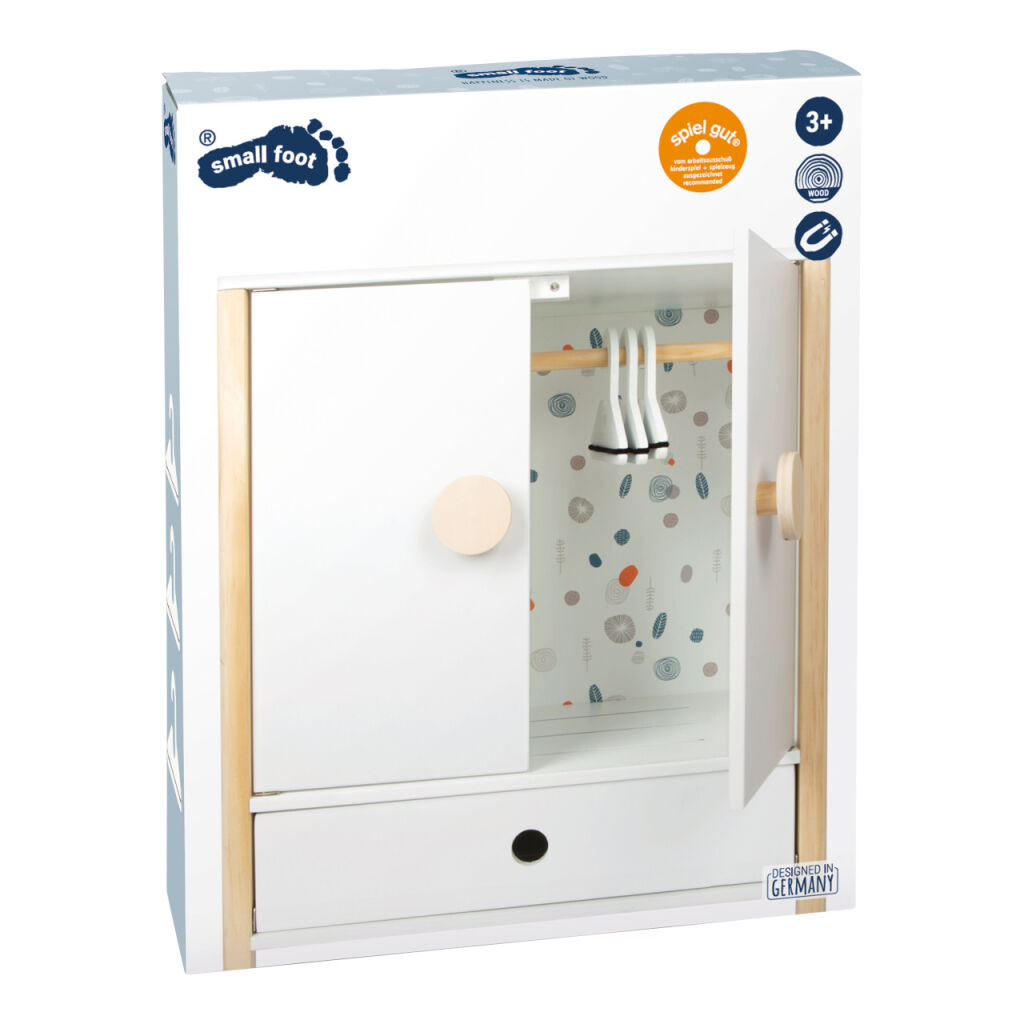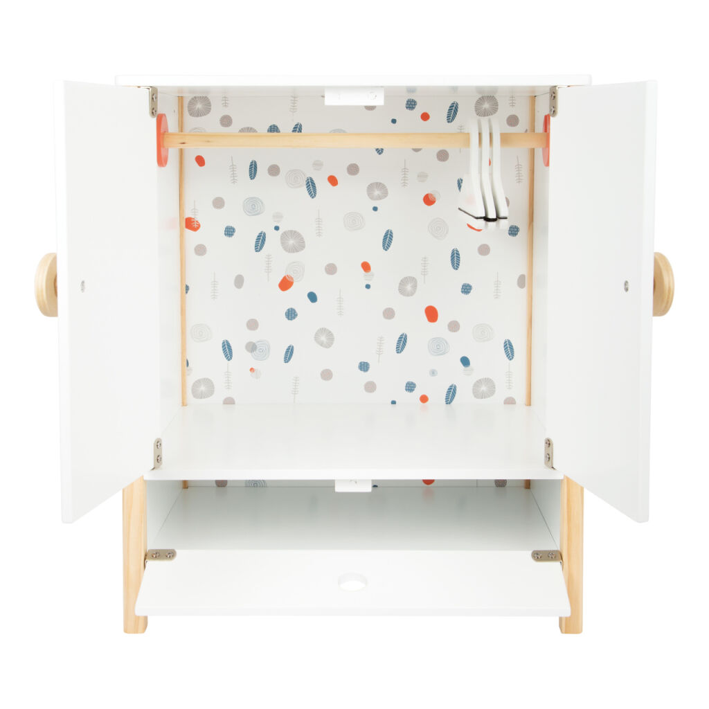 Všechno oblečení pro panenky po ruce. Prostorná dřevěná skříň udělá dojem na každého z vás nejen díky svým jednoduše otevíratelným dveřím. Jednoduchý skandinávský design, uvnitř jemné barevné tóny. Po otevření skříně najdete na šatní tyči ramínka, také oddělitelné poličky a šuplík. Můžete tak všechno oblečení uložit dle vlastního gusta, můžete také použít vlastní ramínka. Díky této hračce se děti naučí důležitosti úklidu a také jak se dobře starat o vlastní oblečení, aby nám vydrželo co nejdéle.