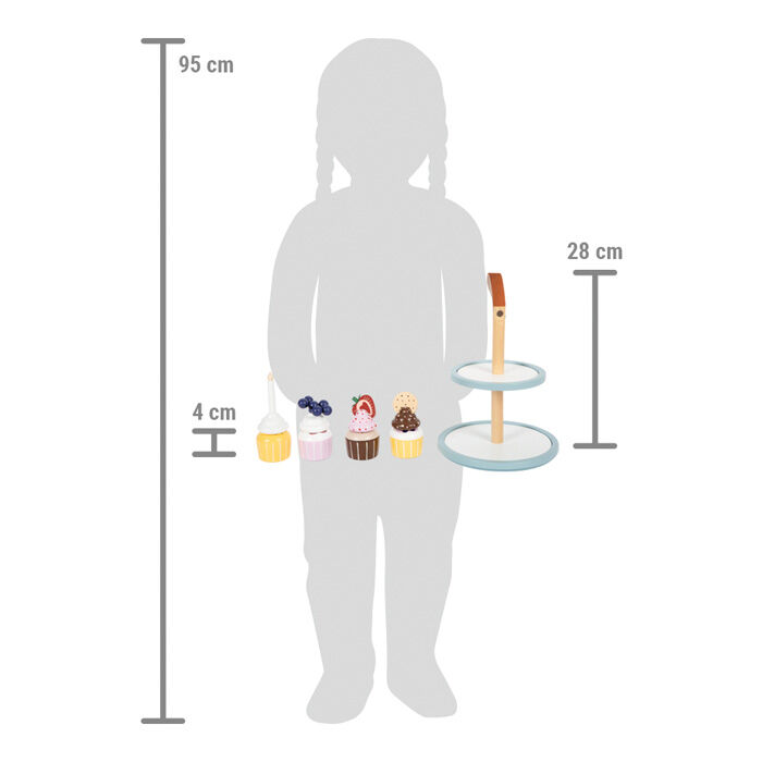Lahůdky do dětské kuchyňky. Tento stojan se čtyřmi košíčky zve malé cukráře k aktivnímu hraní a prezentování lahodných muffinů. Stojan má dvě patra, které slouží k vystavení cukrovinek ve vrstvách. Systém kombinovatelných podstavců a krémových vršků umožňuje široké možnosti kombinací. Jednotlivé dílky společně drží pomocí integrovaných magnetů. Sada je doplněna o dvojitou sušenku, jahodový řez, borůvky a narozeninovou svíčku, kterou lze dorty ozdobit. To povzbudí chuť na čaj s panenkami, medvídky atd.