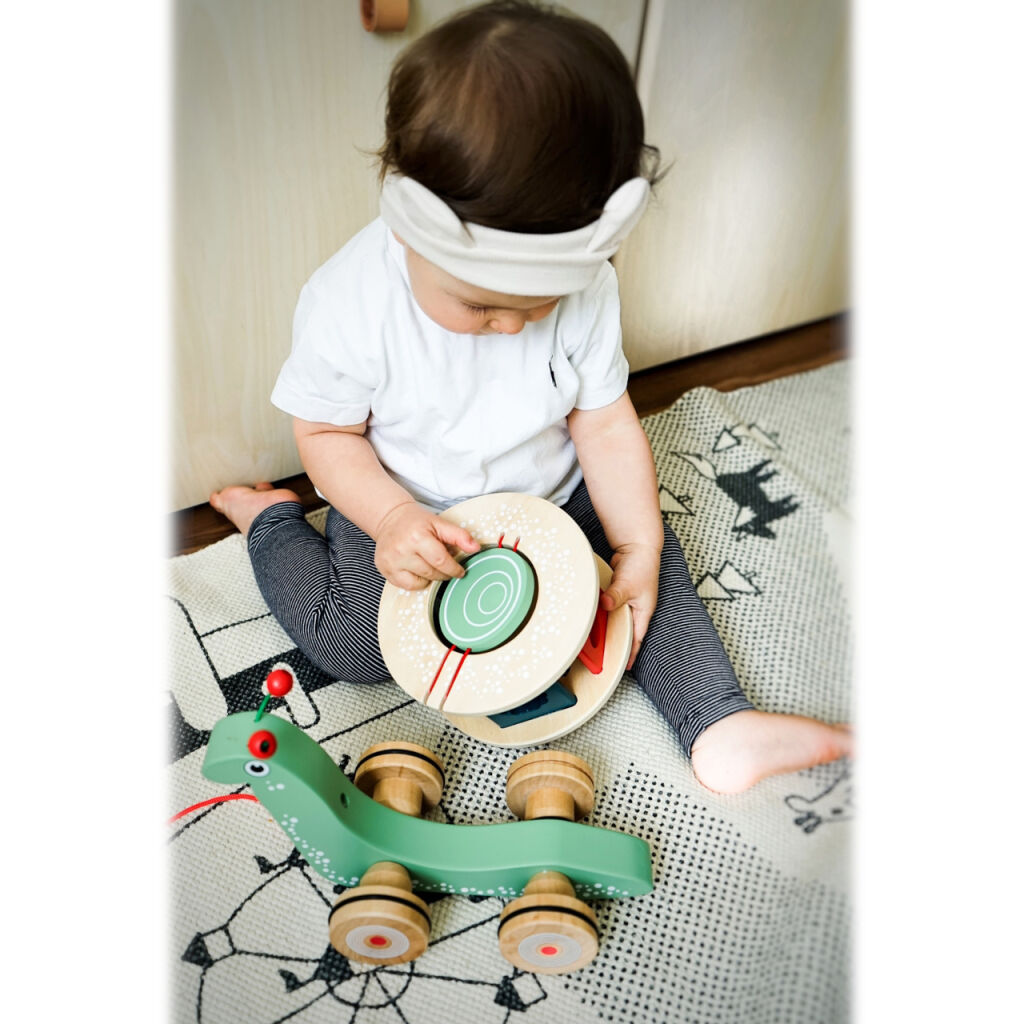 Tato dřevěná tahací hračka s přátelskýma očima, mnoha detaily a pogumovanými kolečky inspiruje děti k prvním krůčkům. Při tahání se šnekova ulita otáčí a dílky uvnitř vydávají zvuk. Dílky můžete pomocí jejich provázků také připevnit na stranu ulity. Hračka je mixem přírodního a barveného dřeva v moderních barvách. Šnekova ulita je oddělitelná a funguje jako vkládačka. Na straně ulity jsou oddělitelná dvířka, kterými můžete dílky z vkládačky opět vyndat. Můžete je také skladovat připevněné na ulitu, aby nevydávaly zvuk. Chytrá motorická hračka perfektní pro děti.