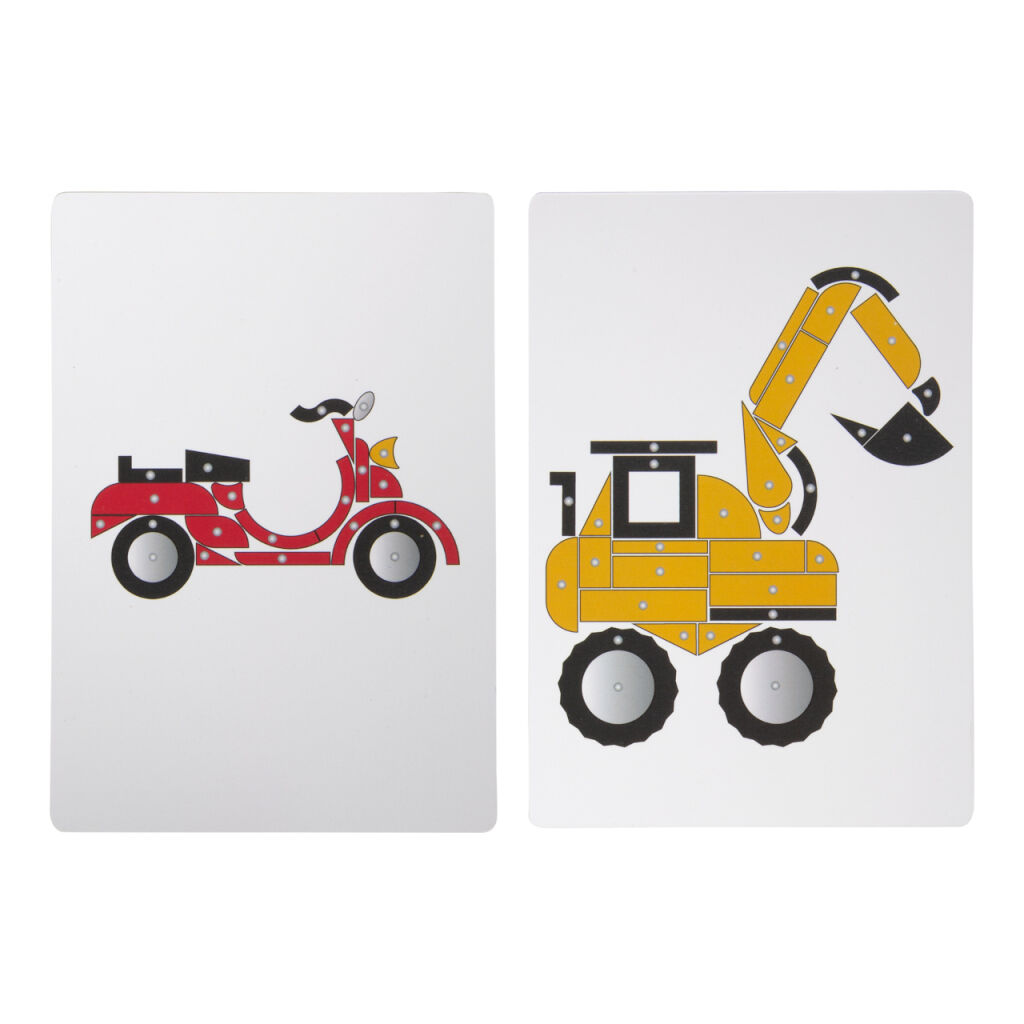 Klasická zatloukací hra v moderních barvách a nesmrtelném designu, s kterou si děti mohou vytvořit obrázky dopravních prostředků, stavebních strojů, aj. Mohou se řídit obrázkovými předlohami nebo tvořit dle vlastní představivosti. Hračka pomáhá s rozvojem kreativity, trénuje zručnost, zlepšuje koordinaci ruka-oko a rozeznávání barev a tvarů. Zatloukací sada je vhodná pro děti malé i větší.