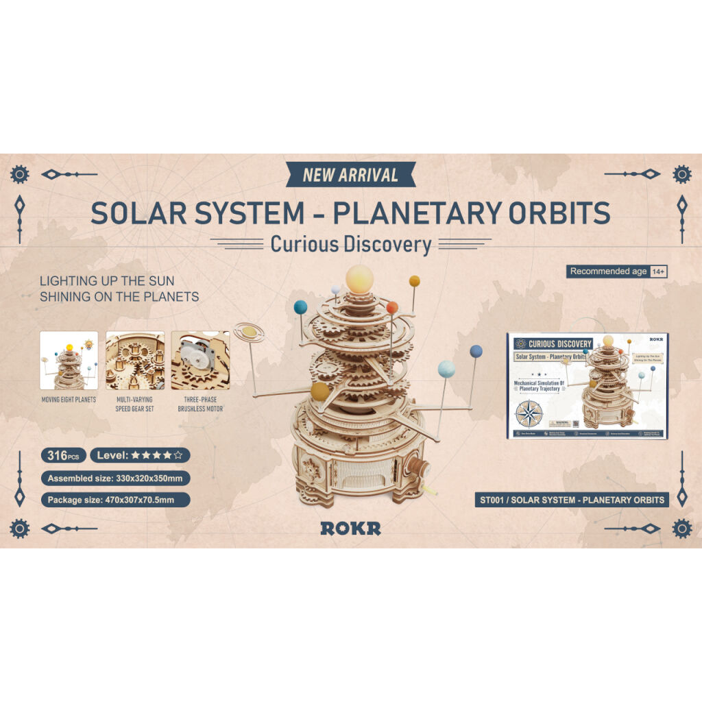 Prozkoumejte Sluneční soustavu se stavebnicí planetária z překližky. Jeho stavba představuje výzvu, která podněcuje zvědavost a můžete při ní rozvíjet své dovednosti. Po sestavení je možno obdivovat osm planet obíhajících různou rychlostí Slunce ve středu modelu. Mechanismus je navíc opatřen dynamem, díky kterému Slunce při otáčení klikou skutečně svítí, a vnáší tím do pohybu neopakovatelnou atmosféru. Planety jsou vyvedeny v pestrých barvách, vyrobeny z odolné buničiny. Pohání je soustava převodů navržená s důrazem na vždy dokonale hladký a plynulý chod. Hotový model vybízí k využití jako názorná učební pomůcka pro děti, ale dovedně také zkrášlí poličku, nebo malý stolek, a zútulní tak pokoj každého fanouška astronomie. Skládačka je dodávána v nesloženém stavu, balena v krabici. Vybaveno detailním návodem k sestavení.