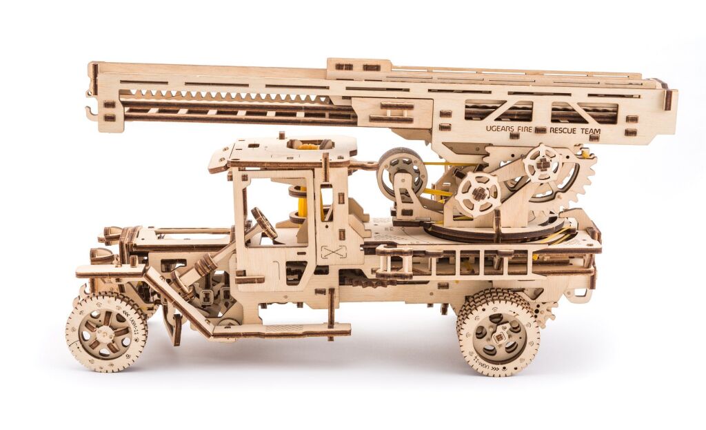 Hasičskou technikou počátku 20. století. Stavebnice nákladního vozu s požárním žebříkem vyrobená z překližky. Patří mezi nejnáročnější modely v nabídce, jeho kompletace Vás bude zvláště těšit. Žebřík lze otáčet kolem vertikální osy, lze jej vysunout až do délky 70 cm a použít jako jeřáb. Mechanika je do detailu propracovaná, a vy tak můžete pozorovat pohyb pístů motoru. Vůz je řiditelný a díky natahovacímu mechanismu je schopen jízdy. Má funkční převodovku pro volnoběh a zpátečku. Může se pyšnit dalšími mechanickými podrobnostmi, plynovým pedálem/ovladačem rychlosti a ruční brzdou. Jízdní dynamice slouží odpružená přední náprava a pogumování kol také zajišťuje spolehlivý kontakt s povrchem jízdní dráhy. Uspořádejte závody s dalšími modely UGEARS! Vybaveno detailním návodem k sestavení.