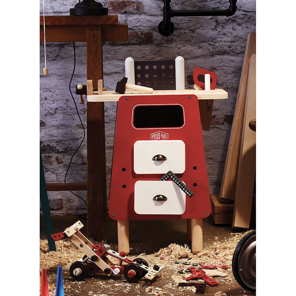 Tento originální dřevěný pracovní ponk s vintage vzhledem dětem umožní tvořit stejně, jak to vidí u dospělých. Magická pracovní deska, která drží pohromadě díky suchému zipu, umožňuje dětem řezat dřevo bez rizika úrazu. Kladivem zaklepou dětské dřevěné hřebíky. Šroubovákem a klíčem věci smontují a opět rozmontují dle gusta. Představivost, trpělivost a vynalézavost. Nechte talent nejmenších zářit! Oboustranný kufr s nářadím od Ateliéru Vilac.