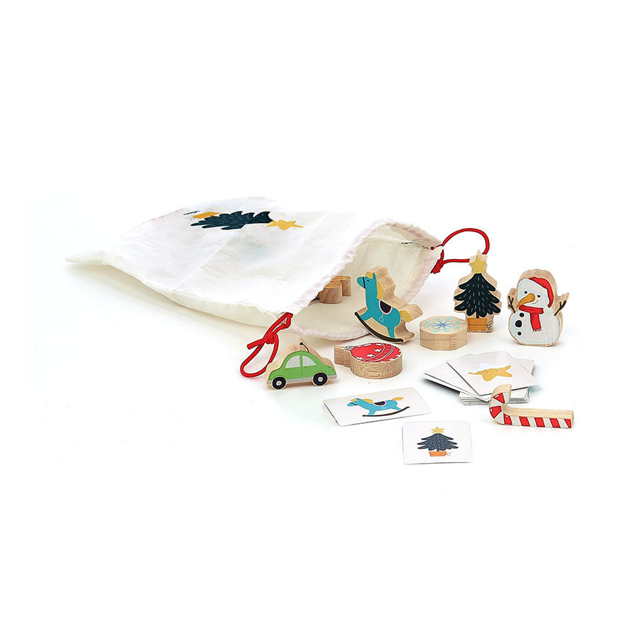 Adventní kalendář, který uvnitř skrývá hru hmatej a najdi! V každém z 24 okének děti najdou dřevěný dílek nebo papírovou kartičku, nechybí ani textilní pytlík. Po otevření celého kalendáře si děti konečně mohou užít hru hmatej a najdi ve vánočním designu.
