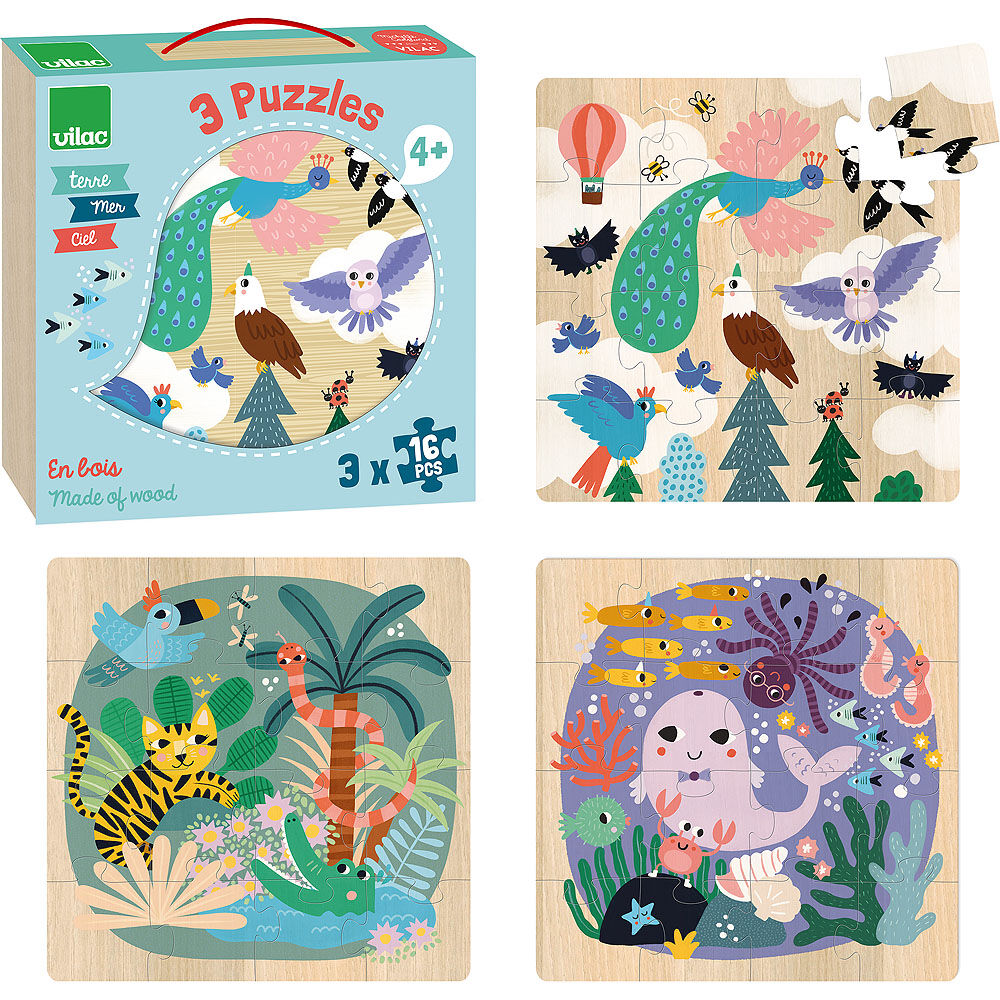 Sada 3 obrázkových puzzlí v praktické krabičce. Ilustrace Michelle Carlslund představují tři scény různých přírodních prostředí na souši, v moři a na obloze. Scéna v oblacích s velmi krásným pávem, orlem, sovou a dalšími různými ptáky. Další scéna ve vlnách s velkou velrybou, chobotnicí, mořskými koňmi a jejich přáteli rybičkami. Konečně poslední v džungli s tygrem, který se baví s krokodýlem, hadem a papouškem. Puzzle podpoří učení obratnosti a pozorování.