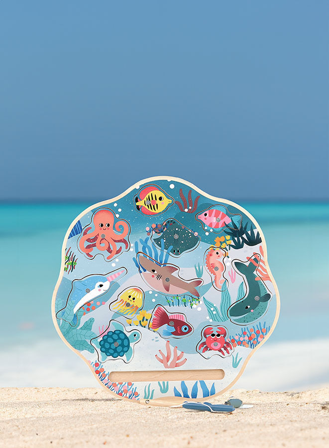 Magnetická hra, která Vás opravdu nadchne! Rybařte s mořskými živočichy v krásném designu od ilustrátorky Michelle Carlsund. Podaří se Vám z moře vytáhnout rejnoka, velrybu, kraba, želvu či medúzu? K dispozici je celkem 12 barevných mořských zvířatek. Chyťte je všechny! Každý živočich má na zadní straně číslo, které označuje body. Až se Vám podaří vytáhnout všechny mořské živočichy, otočte je dnem vzhůru a spočítejte si body. Při hře tedy nezáleží na tom, kolik zvířatek se Vám podaří prutem vytáhnout, ale na tom, kdo má více bodů. Hra stimuluje kognitivní vývoj vašeho dítka. Rozvíjí koordinaci ruka-oko a jemnou motoriku. Podporuje také smyslové a vzdělávací učení.