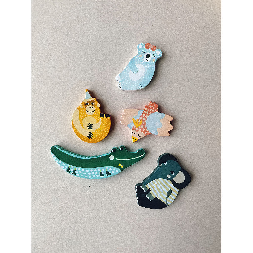 Pěkná senzorická vkládačka pro děti, plně dřevěná. Když děti z rámečku vyjmou dílek, objeví pod ním určitou látku, která má pod každým dílkem zvířete jinou texturu. Ilustrováno Michelle Carlslund.