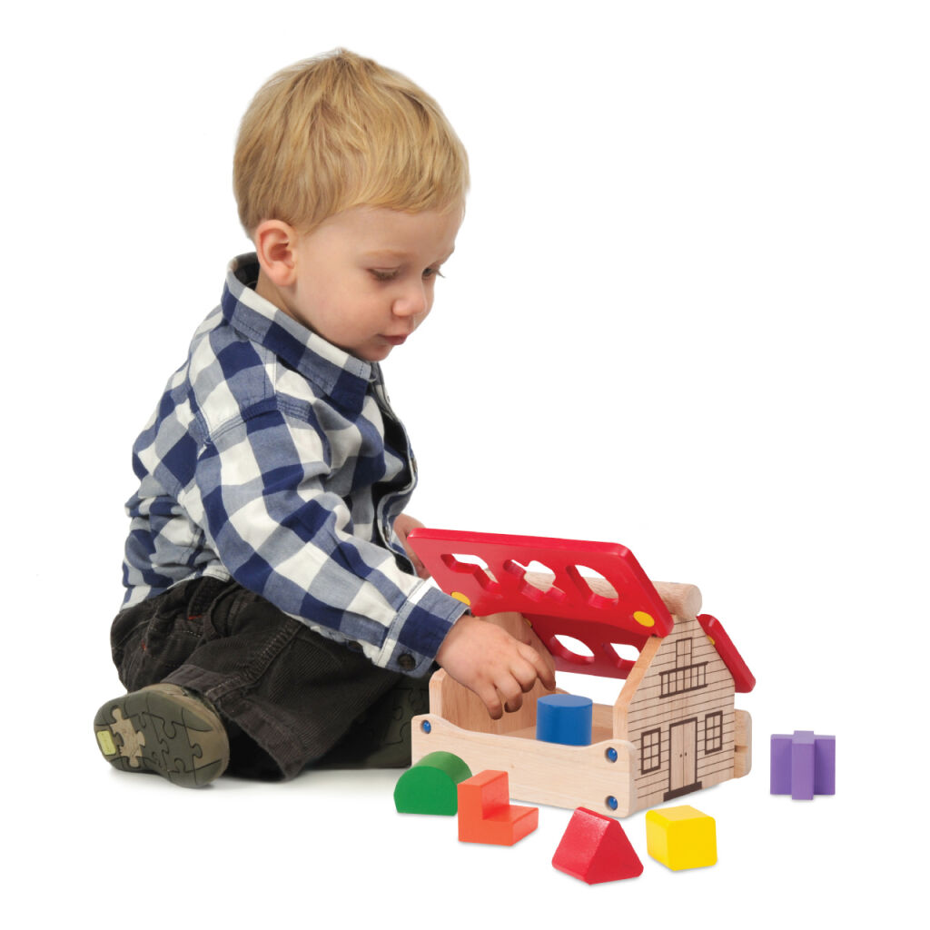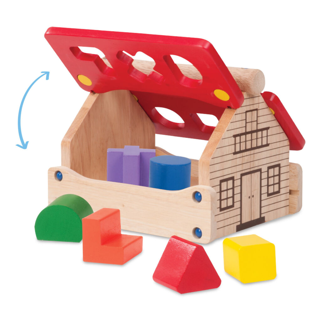 Vkládačku v podobě domečku děti využijí i při mnoha jiných hrách. Děti s její pomocí mohou provičovat rozpoznávání barev, tvarů a jemnou motoriku. Díky otevíratelným dílům střechy a praktickému madlu může posloužit i jako úložný prostor pro další drobné hračky. Vkládačka je vyrobena z odolného masivního dřeva a kombinuje příjemné přírodní a atraktivní syté barvy.